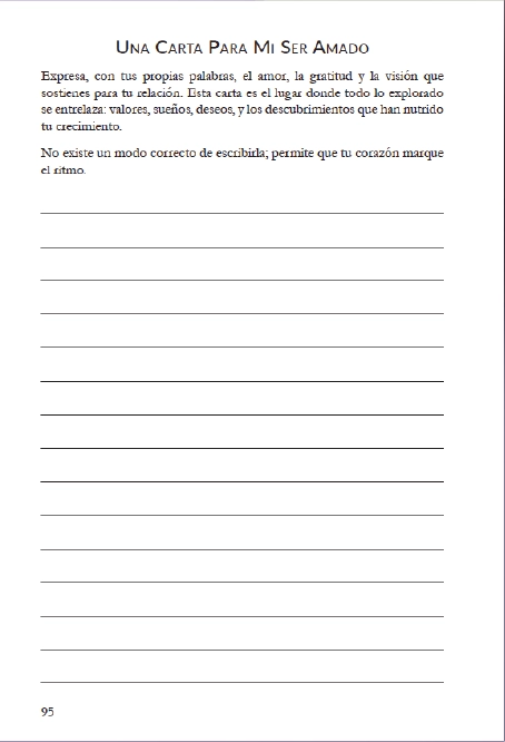 Cada miembro de la pareja trabaja en su propio diario guiado a su propio ritmo. Después de completar una sección, los diarios se intercambian, creando un ritual de honestidad, comprensión y presencia.