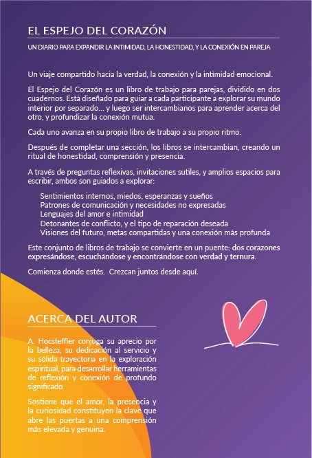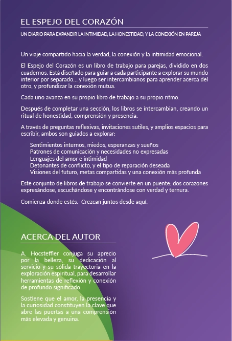 El Espejo del Corazón es un diario para parejas, dividido en dos partes, diseñado para ayudar a las parejas a explorar sus mundos interiores por separado y luego intercambiar los diarios para profundizar su conexión.