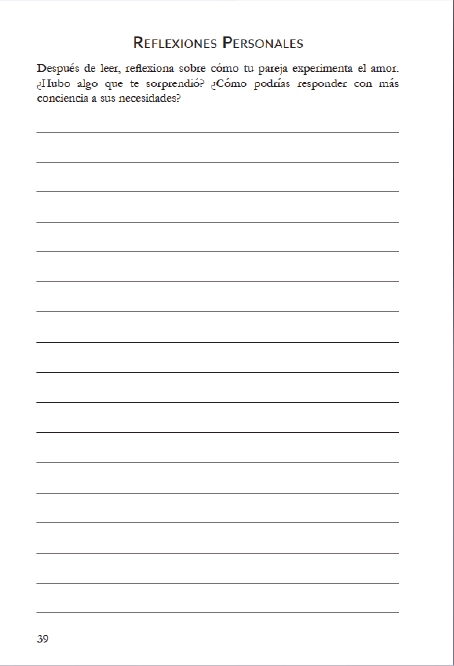 A través de preguntas reflexivas, reflexiones inspiradoras y amplios espacios para escribir, ambos miembros de la pareja están invitados a explorar: