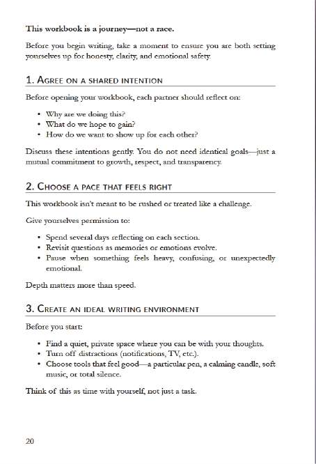 Each partner works through their own guided journal at their own pace. After completing a section, the journals are exchanged, creating a ritual of honesty, understanding, and presence.